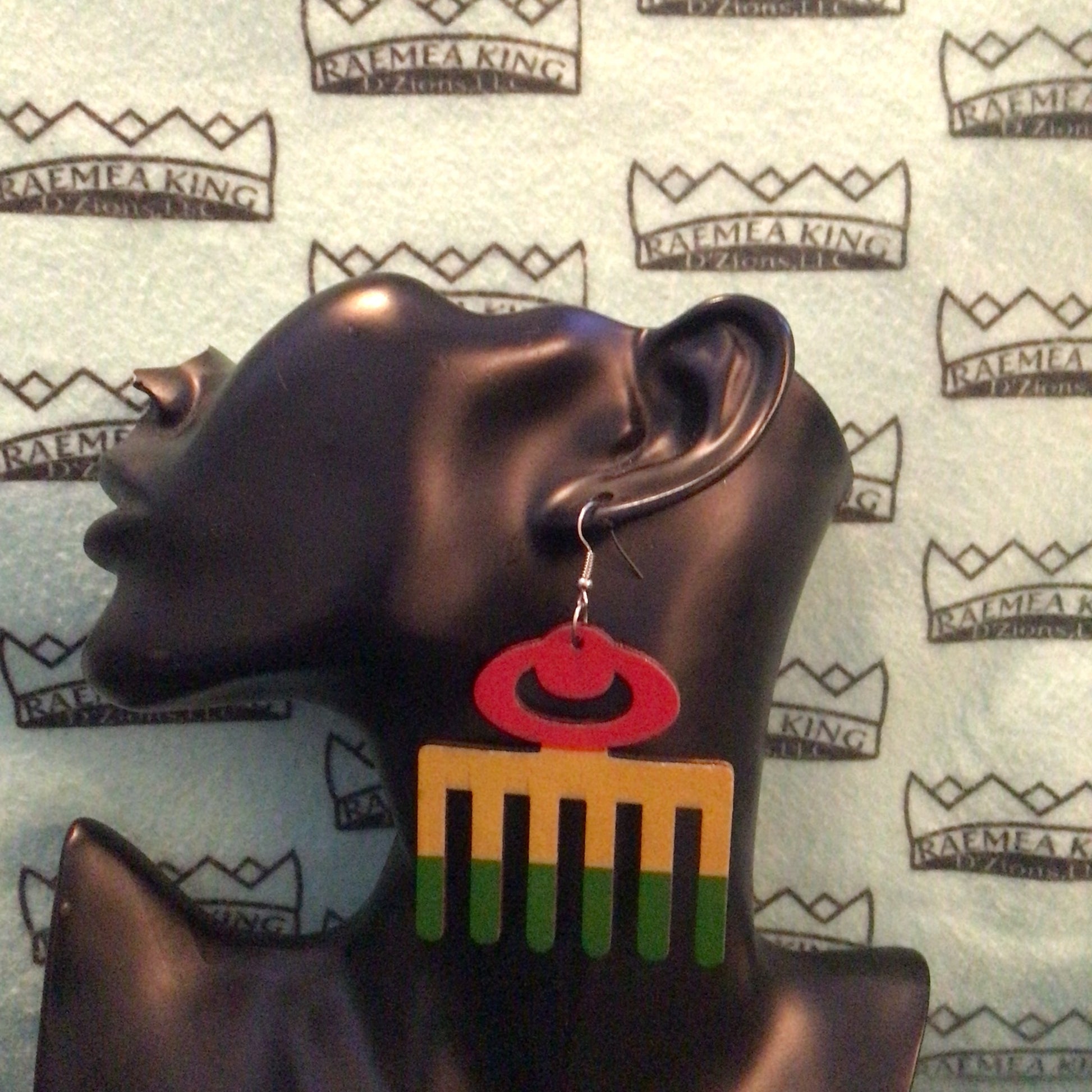 Adinkra Symbol- Duafe meaning femininity and love and care, in red, yellow & green.